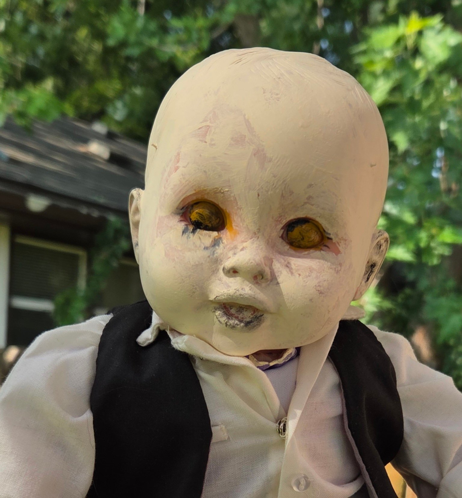 The Spooky Creepy Laughing Horror Artist Doll "Andre" is a unique and handcrafted OOAK piece by artist BeBeStrange. Standing at 11 inches tall with a bald head and light complexion, this gender-neutral doll features bendable limbs, a soft body, and battery-operated voice. Perfect for Halloween and gothic horror themes, this artist doll is made of plastic and fabric materials, with gold eyes and laughs. Deliberately repainted and non-scented, this one-of-a-kind doll is a must-have for collectors and fans of creepy and macabre artwork.