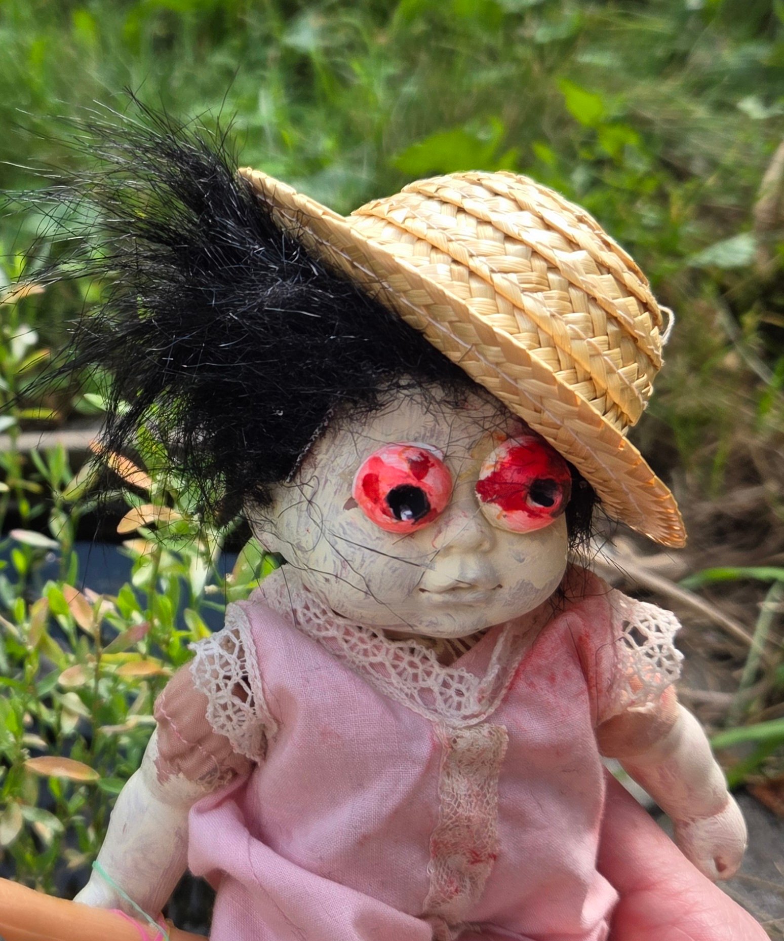 The product is a unique and creepy doll named "Harriet" created by artist BeBeStrange. This horror-themed OOAK doll features a black straight hair, light complexion, and varies eye colors. Handmade in 2021 in the United States, this gender-neutral doll comes with accessories, outfit, hat, shoes, and is made of plastic and fabric materials. With a length of 9 inches and weighing 0.5 lbs, this non-scented and repainted doll is perfect for Halloween or Gothic & Horror-themed occasions for ages 17 and up.